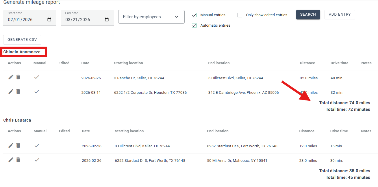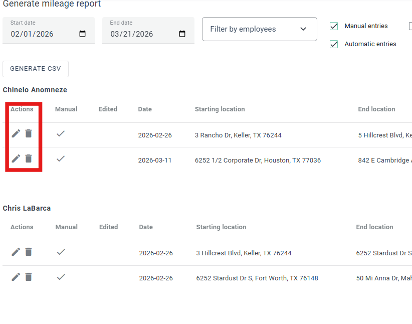 Entries can be edited by selecting the pencil icon next to the record. Addresses, distance, and drive time can be adjusted as needed. Entries can also be removed using the trash icon.
