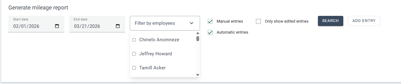 From here, choose the date range you would like to view. You can also filter by specific employees. If no employee filter is applied, the report will display mileage for all employees.