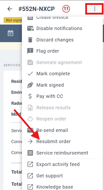 After entering the information, click Review and resubmit the order to save changes. Updating a custom field does not automatically trigger email notifications, and any triggered notifications can be unchecked before sending.