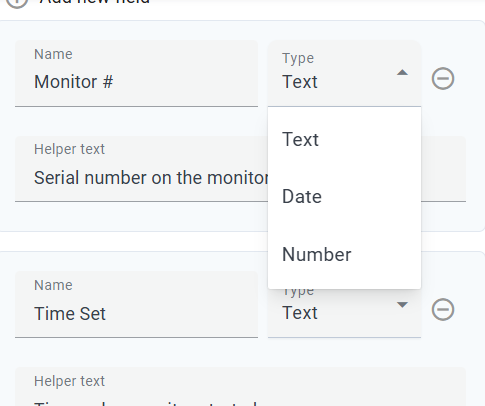Custom fields allow you to collect additional service-specific information. Available field types include text, date, and number. Each field can be given a name and optional helper text.