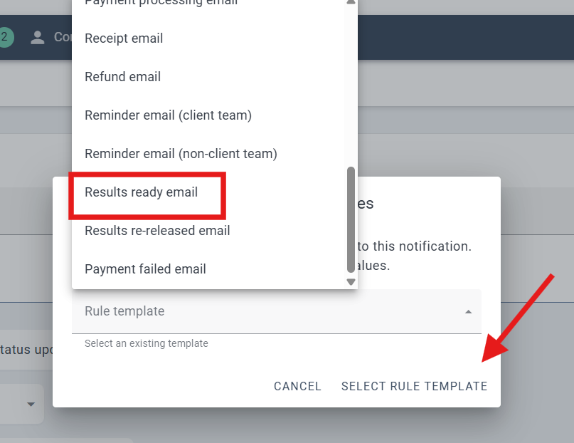 Load the Results Ready Email template and click Select Rule